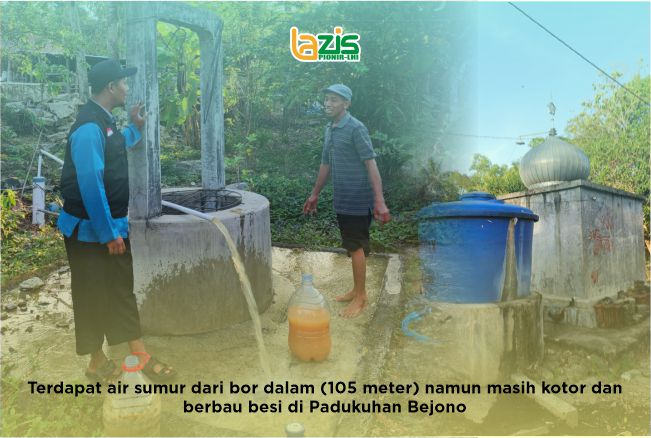 Selama muslim kemarau, 2 RT di padukuhan kami sering mengalami kelangkaan air bersih, ada air PDAM namun ketika kemarau tidak dapat menjangkau 2 RT di puncak bukit ini. Alhamdulillah beberapa waktu lalu ada Donatur memberikan Sumur Bor Dalam (105 meter) namun air yang keluar masih keruh dan berbau besi belum bisa dikonsumsi. Kami berharap bisa mandiri air bersih dengan adanya tandon air permanen dan filter penjernih air begitu harapan warga Padukuhan Bejono, Beji, Ngawen, Gunung Kidul, DIY.